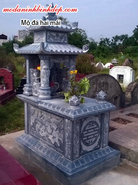 Mộ đá hai mái cũng có các kích thước cơ bản như mộ không mái đá : kích thước bé là 69×107 cm, trung bình 81x133cm, 89x133cm, 89×147 , cỡ to 107x167cm , 127×173 … kích thước của mộ đá phụ thuộc nhiều vào ý kiến của khách hàng, chúng tôi chỉ đưa ra những gợi ý tương đối và tất cả kích thước chúng tôi đưa ra đều là số đỏ của thước lỗ ban.